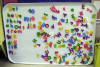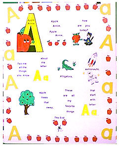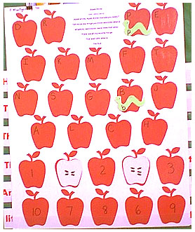 Alphabetical Order: I had the TA cut oval shapes from colored construction paper using the Ellison machine. To make the ovals the right size, we used the center only of the capital "O". There are 8 ovals each of about 5 different colors. (8 ovals of one color, and 5 different sets) Then I programmed each set of ovals with one word per oval <none of the words have the same first letter> and laminated all sets. Once they were laminated, we added a small piece of magnetic tape to the back of each oval and placed them in a labeled ziploc bag. The student gets all the words and out and places them on a magnetic surface (storage cabinet, filing cabinet, magnetic chalkboard, teacher's desk, large oil pan, etc.). Then alphabetizes the words in each color group. (Will add picture later ... this activity is at school) Be sure to check out the Pocketcharts and Literacy activities above. I do A LOT of my Centers using pocketcharts. So many Center ideas are listed there. Colorful Color Words: Cut out all the color words letters from the appropriate color construction paper using the Ellison machine. The word "red" will be cut from red construction paper, "blue" will have blue letters, etc. Glue each letter to a vertical 3x5 index card that you've trimmed off 1" inch. (This is because the pocketchart rows are only 4 inches a part and you don't want them to overlap) Before gluing, lay all the cards down on a table in line. Now line your letters up on the cards where they'll be straight. I can't stand to have them look like they're zig-zagging once you get them in the pocketchart (yes, I'm a perfectionist .. can't you tell? :) ) Once you have them lined up properly, THEN glue the letters onto the cards. Then laminate. The students will use the pocketchart and place the letters in the appropriate order to form the color words. Instruct them to use the red letters only to form the word "red". Use the blue letters only to form the word "blue", and so on. If they'll need it, have a color words chart available for them to look at as a model. (picture coming) Name Necklace: This activity covers several scenerios. It can reinforce spelling of first name, spelling of first & last name, and matching capital to lowercase letters, in addition to the fine motor skills that it requires. I'm having my students this year make a necklace using their first and last names. They all know how to spell their first names, but I have some that either don't know how to spell their last name or they just learned over the summer. They have to thread all capital letter beads on a metallic cord to form their first and last name with a heart separating the two. For those who don't have a really good grasp on their letters, they have to be able to transfer the lowercase letters in their name into capital letters. I provide an ABC line for those who need it as well a name plate showing the heart in-between the first and last name. Tip: to keep the beads from sliding off the cord during the activity, tape the left end of the cord to the table on the left side of the student. That way it forces them to work from the right to the left and it also averts the normal "dropping of the beads". Gumball Colors: I made this activity using patterns from The Mailbox, but I altered it. I have a gumball machine pattern with circles inside. I programmed each circle with a color word. Each color word has a matching gumball (same size circle cut out and colored to match). Students match the colored gumball to the color word. ABC Puzzle: Match a picture to the correct capital and lowercase letter. This is a purchased puzzle set. The picture is in the middle and the capital letter is on the left and the lowercase letter on the right. There are 26 "puzzles" in the box. Each puzzle has 3 pieces. ABC Sequencing: Students sequence beads with capital letters onto a string. Next week they'll do lowercase letters. They can use the ABC line on the wall, the ABC chart, or the ABC lines as a model. (ABC lines ... stick on desk ABC line stuck instead onto a sentence strip and laminated. Number lines are put on the back of the strip.) Word Wall: Use a cookie sheet with a Spelling Mat inside. Students choose 8 words from the Word Wall to form with magnetic letters. Go Togethers from Lakeshore: This activity comes in a nice little aqua carrying case. It has pictures of everyday and not-so-everyday activities and the children sort manipulatives onto the correct picture. For ex: Farm picture - plastic cow and a small bale of "hay" (this is one of those decorative "country style" bales from the 80s) Bathroom - copper toilet (which is really a pencil sharpener) and a tiny plunger Boy looking at his teeth in mirror - tiny toothbrush and toothpaste Apple orchard - small basket and apples Bare feet - doll sock & shoe Snowy day - tiny muffler & toboggan