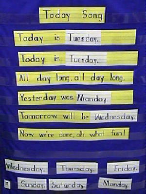 Daily News: At the beginning of the year, I always start out using Daily News. Then as the year progresses and time gets tight, I usually drop off doing it. I do Daily News with the children. I have a "short" chart tablet that I put on my easel. I sit in a chair and write as they tell me what and how to write it. The News always follows the same format each day. It looks something like this: