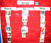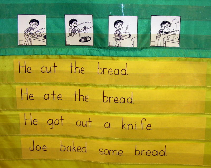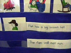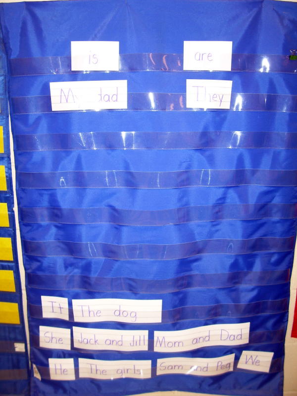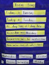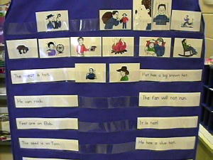 Here's another activity I added to our Morning Meeting. Morning Meeting is when we go over our Calendar, Weather, Days of the Week chart, Months of the Year chart, seasons, coins & their value, how much money we should have in our bank (according to the date for the month), Month Poem, Word Wall, Today Song, Pledge, & Book of the Day (not necessarily in that order). This is the Today Song. We read the song first and a designated student gets to put the correct words in the blanks while being helped by the rest of the group. Then we reread the song, then we sing it a couple of times while I track with my pointer. The tune is Frere Jacques. If you visit my individual theme/unit pages, you'll see many other ways of using pocketcharts as well. I also use my pocketchart to help reinforce comprehension. I copied pictures from our reading skills pages and typed up simple sentences to go with them. The children then match the correct sentence to the picture. The pocketchart is big enough to accomodate two rows of sentences (printed landscape onto cardstock and laminated) and two matching pictures on 3x5 index cards (also laminated).