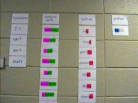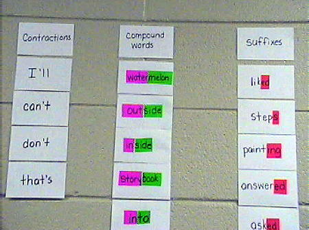 :) Since she posted it on the World Wide Web, it will probably be floating around and shared over and over again at the beginning of the next school year as a new "Kissing Hand " song! Contraction Crash Dummies: Someone shared that they used two crashing cars (pictures) as visuals to teach contractions. She had "can" written on one car, and "not" written on the other. Then she crashed them into each other and told her first graders that "n" and "o" did not have on their seatbelts and were thrown from the car. Then they were replaced by the apostrophe. This helped her students to remember where to put the apostrophe and she was able to incorporate a safety lesson into the lesson as well. If you laminated the cars before adding the words, you could reuse the cards, AND by labeling the cards with a Vis-a-Vis pen, after the crash you could wipe out "n" and "o" and replace them with the apostrophe. Compound Words: Several good activities have been shared lately dealing with compound words. I've already shared the one in the pocketchart section. Here are some more. * To introduce compound words, you might want to start out with a visual. You'll need 3 pictures for each compound word. For example, football. You'll need a picture of a foot, a ball, and then a football. Fold a piece of cardstock into thirds where two flaps meet together OVER the third section (the size of your cardstock will depend on the size of your pictures). Glue the picture of the foot on the edge of the first flap away from the fold. Then it's optional whether or not you write the word underneath it. Then on the next flap, glue the ball on the edge away from the fold. Then open the flaps up and glue the football inside the flaps. When finished, you should have the picture of the foot on the first flap, and ball on the second flap. When you open it up, you'll have the football inside. * Write compound words onto sentence strips, and to demonstrate how a compound word is two small words put together to form a a new larger word, snip the two smaller words apart. After the students are very familiar with the words, distribute a word card to each student and have them find the person who has their "other half" of the compound word. To help them distinguish which word comes first/last, you could color code the words. All the words that come first could be green, and all the words that come last could be red. You could also have the students match these words up in the pocketchart. * Another pocketchart activity could be to provide the students with pictures of things that are compound words: doghouse, butterfly, boxcar, hotdog, cupcake, football, etc. Then provide them with the words on cards to use in forming each compound word. They would have to form the compound word to match each picture. * I also do a hand motion that hopefully helps them visualize it a little better.