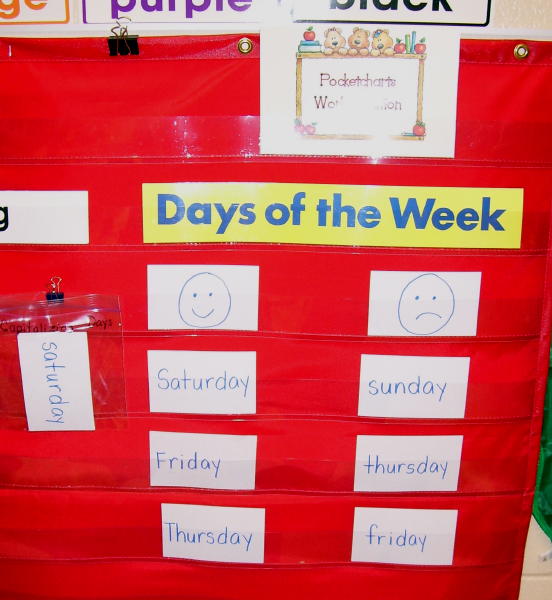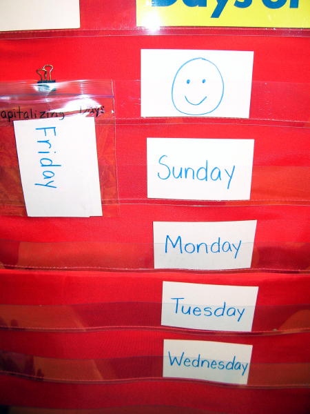 This brings me to another activity that I use the pocketchart for: Spelling. I made letter cards using Excel and printed them out on cardstock. Then I had them laminated and cut them out on the grid lines. I made them tall enough so that the letters would stick out over the top of the plastic strip on the pocketchart, but narrow enough to fit in the tiny drawers of a bin where I store them. My aide donated one of those bins with the drawers that are purchased to put screws and such in. She painted it for me, then I added the capital and lowercase letter label to the front of each drawer. The letters are stored in this bin. The children use the letters to form each of their spelling words in the pocketchart. Once they've formed all words, then an adult checks their work. Any words misspelled or redone. Once given the "all clear" sign, the students resort the letters back into the drawers for the next student.