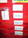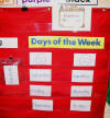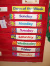 This was my Word Wall. I used a graphics program and typed up all the sight words in different colors and two words to a page. I printed them out onto cardstock, cut them apart, and then had them laminated. Now I can use the sight words from year to year. We started off the year with the students' names and then I started adding 5 new sight words per week. One year, after doing the students' names I started with the color words, months, days of the week, and sight words simultaneously. (I added one color word and sight word a week; the month and day of the week as it came.) Last year, since I'd made the words bigger, I knew I wouldn't have enough room for all the words, so I changed how I introduced them. On the "calendar wall" I had the days of the week and months of the year posted, and I had several charts of the color words for the students to use. Even with deleting all those words from the Word Wall, I still didn't have enough room for all the words we'd covered.
