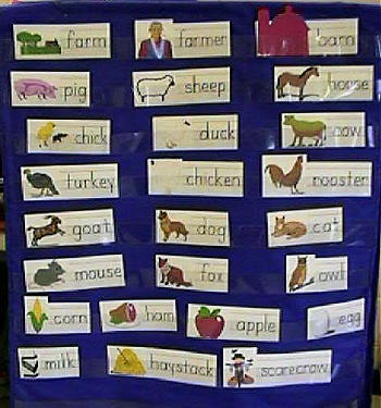 The thing with the drawers came about because I have one student who just doesn't have the organizational ability/reasoning/persistence to sort through all those letters looking for the ones that he needs. Putting them into "categories" allowed him to now successfully accomplish this activity. And now that I have all the letters pre-made, I use them in other activities besides the Spelling Words activity as well. I also use my pocketchart as a portable Word Wall sometimes. I don't really have a good place for a Word Wall this year, despite the new classroom, so I use my pocketchart for a theme/unit based Word Wall. I type up vocabulary words, add a graphic, then print them off on cardstock. Laminate and cut them out, and they're ready to be used in the pocketchart. Be sure not to make your word cards any taller than 4 inches or they'll overlap onto the next row. The good thing about this Word Wall is that it's the height of your students and they can manipulate the word cards. You can also make an extra set of cards without the picture and have the students match the words. You could use the word cards in conjunction with the letter cards and have the students build the words as well.