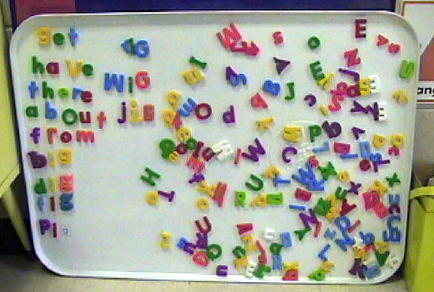 Magnetic Letters ~ I keep two kinds of magnetic letters stored in painted coffee cans. The students use these to form words on a magnetic easel. You can also buy an oil drip pan at automotive stores and use it as your magnetic surface. The pans look like HUGE cookie sheets. (Take a magnet with you when purchasing one to make sure it's magnetic.) You can also provide students with individual sized magnetic boards by providing them with a small cookie sheet. You can make reproducible type activities and use them in this Center by having your students place the paper on the magnetic surface and instead of writing letters or words, they use the magnetic letters. If you provide the students with pictures of objects they can form the picture name using the magnetic letters. They could also indicate the beginning/middle/ending sounds.