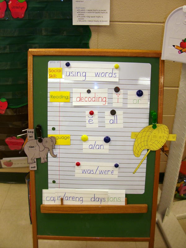 *find as many of their spelling words as they can on a page of the newspaper and highlight them with a highlighter *write their words in shaving cream *Rainbow Words: I provide them with their spelling words typed out in a large dotted font and they trace over them with at least 4 different colors. (The font is Zyia Learns Letters and can be found at Billy Bear's Playground and at The Teacher's Parking Lot to download) *Letter Tiles: I provide them with all the letters they need to form all their words using 1 inch paper letter tiles. They cut out the tiles and glue the words on another sheet of paper to form their spelling words. I have a blank grid on a sheet of paper that I reproduced many times. Then each week I just fill in the grid (mixing up the letters) and copy them if needed for each student. *Word Scramble: I go to Educational Press and create a word scramble using the spelling words and print them out. *Word Searches: This is very hard for some of my students. I go to Puzzlemaker and create word searches using their spelling words. *Magazine Words: They find their words in magazines and cut them out, or if they can't find the words, they find the letters and build them on a sheet of paper. *Slates: They practice spelling their words on slates (mini-chalkboards) with someone else calling them out. They use old, clean socks as erasers. *White Boards: This is the same activity as above, but we use mini-white boards. A student teacher gave me enough for my class when she bought a piece of showerboard and had it cut into 1 foot squares. She covered the edges with electrical tape. I also use the whiteboards on Thurs. sometimes to have a practice spelling test. I call out a word, we WRITE, HIDE, and then when I say SHOW we all turn our boards around. I participate by writing the word as well, and they check their word by mine. They really like doing this. *And sometimes I just have them write their spelling words 3 times each. Boring! :) *Use the magnetic letters to form their words (see picture above) *Use letter stamps and ink pad to stamp words on paper *Use playdough and playdough letter stampers to form words. *Pocketchart Spelling shown above using pocketchart letter tiles * Plastic Letter Tiles: Provide students with a Spelling Mat and have them form their spelling words using the plastic letter tiles. The tiles were purchased from Wal-Mart and are now stored in a plastic storage box with 24 compartments. The box I also purchased from Wal-Mart in the hardware section. I labeled each compartment with a capital and lowercase letter. The children initially sorted the letters into the compartments. The Spelling Mat is a sheet of construction paper divided into rows according to the size of the letter tiles. Then the mat was laminated. Students use it to keep their letters in line and neat. *Spelling Rods: I just purchased spelling rods for my students to use to form their spelling words. They look like Unifix cubes, but have letters on all 4 sides (caps/lowercase). Vowels in red, consonants in blue.
