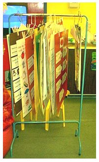 Chalkboard Easel ~ I have a child sized free-standing chalkboard that the children can use to write on. The resistance of the chalk on the board is good for those students who have poor fine motor skills. Big Books ~ The chalkboard that I mentioned above is also a Big Book easel. The magnetic chalkboard has a large piece of wood that you put across it to hold the Big Books. The wood has two small pegs to hold the book. You can move or remove the wood as you please since it is held on by a magnetic strip. I'm now using this as a Big Book Center (from Literacy Workstations by Debbie Diller). She also suggested having the usual pointers to use, but adding other aspects to the Center as well, such as finding sight words in the book and highlighting them with highlighter tape (see Teacher Tips for alternative to commercial highlighter tape). You can also have sticky notes with words from the book that you'd like for the children to find in the text and have them stick the words on top of the word once they've found it. You can also add a writing aspect by having them make a list of sight words that they find, or write about their favorite part of the book. This Center can be for two students. Model with them how one can use the pointer while the other turns the pages. They take turns reading, then once they're finished, they swap jobs.