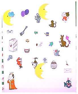 American Heritage Children's Dictionary Multimedia Nursery Rhymes Reading Development 2 Library Reader Rabbit I Can Read With Phonics Curious George Goes Home Kid Pix Studio Puzzles ~ I have many different kinds of puzzles that deal with themes/units that we're studying as well as puzzles for matching capital/lowercase letters, sequencing ABCs, color words, etc. File Folders ~ I have a tub full of all levels and types of file folder activities. The students look through and find the ones that they know how to do or the ones that they want to try. Almost all of the activities were made using the File Folder teacher resource books. A few were made using graphics software, and some were made using Ellison die-cuts. Mailing Center ~ I have a desk set up in my classroom where students can go to write messages and make cards to mail to me or their classmates. We have a central mailbox in which each student has their own mail slot. The desk is stocked with scrap paper, stamps, and cards. The mailbox is made from a wine box that I covered with contac paper and set on its side. The dividers that are built into the box to keep the bottles from breaking make perfect mail slots for us. Each slot is labeled with a student's name. Flannelboard ~ I try to keep something up on our flannelboard for the students to manipulate while retelling a story. Right now we have the 3 Billy Goats Gruff up there. I photocopy blackline pictures onto cardstock and have the aide color them with markers. Then they're laminated and cut out. To make them stick to the flannelboard, I hotglue pieces of sandpaper to the back of them. I try to have flannelboard pieces for each of the units/themes that we do. I've also bought several of those kits that go along with books that have the manipulatives for the book. The manipulatives can be used on the flannelboard.