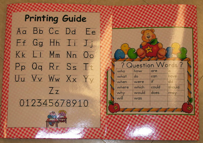 front - since I teach K-2 you'll see aids for a myriad of skills; here a manuscript printing guide as well as a list of the question words with blanks where I can add in new words with a black Sharpie