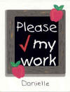Each Monday, I assign 5 Must Do Centers. These Centers are "housed" in tubs on a low shelf. (You can see a picture of the tubs at My Room) I rotate the Center activities each week. Every Monday morning, instead of doing a whole group thematic activity, I go over each Center. We work through the Center together if necessary until I'm certain that they understand what they need to do, since I won't be there to supervise them when they're working ... and starting this year (2002 - 2003), I'll no longer have a TA for assistance. So it's important that they be able to complete the activities on their own. Each student has their own Work Card with a graphic of a chalkboard on the front that says, "Please check my work" and on the opposite side a construction worker. That side says, "Under Construction." Both sides have the student's name. Once they finish a Center, they put their Work Card on it that says , "Please check my work." Then when I get a free moment, I can check for accuracy. If there are items wrong, then the student is instructed to rework them, and I reteach if necessary. The opposite side of the Work Card, "Under Construction" is used when the student is called away from a Center and isn't finished. They place the "Under Construction" side of the Work Card on their work, and other students know not to "mess with" it, and I know that it's not ready to be checked.