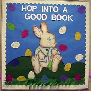 Bulletin Board: This board belongs to the K teacher next door. She created Peter on posterboard and then added the coloring using pastels. You can also use colored chalk; then you need to laminate to keep the project from smearing. You have to add color, then rub to get the lights and darks. The eggs contain books that they've read.
