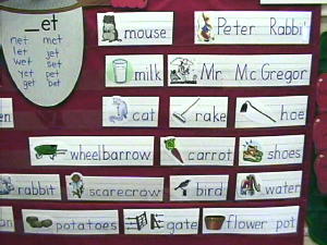 These are pictures of my Thematic Word Wall. The pictures of the characters were scanned from the book and printed onto cardstock (except for Mr. McGregor as the pictures of him were too small). The other pictures all came from the 'net. This is a double wide pocketchart from Lakeshore, so it will hold LOTS of vocabulary words.
